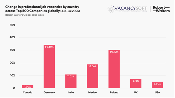 - Vacancies in the world’s 500 largest businesses up +9.2% in July compared to June, with Germany (+34.3%), and Poland (+30.4%) among the strongest performers.
